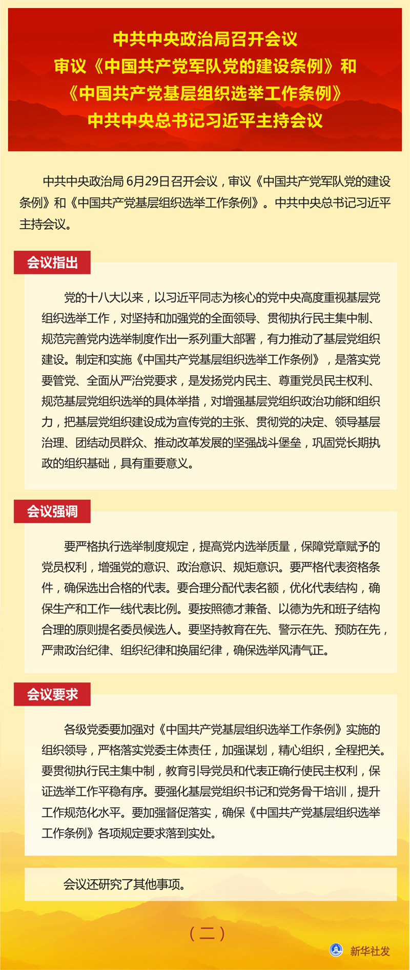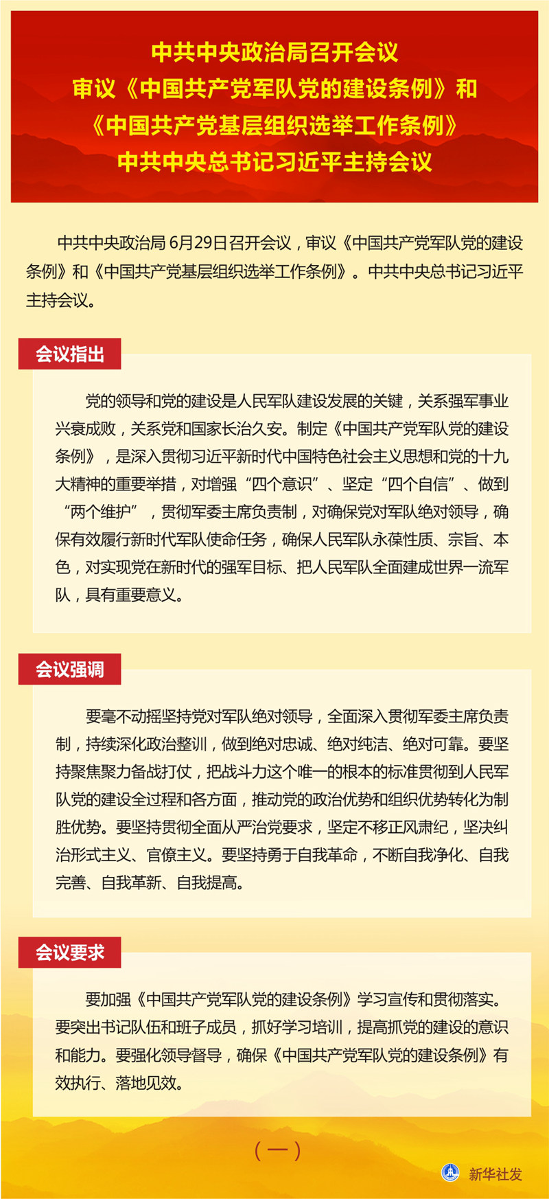 中共中央政治局召開會(huì)議 審議《中國(guó)共產(chǎn)黨軍隊(duì)黨的建設(shè)條例》和《中國(guó)共產(chǎn)黨基層組織選舉工作條例》 中共中央總書記習(xí)近平主持會(huì)議 新華社北京6月29日電 中共中央政治局6月29日召開會(huì)議,審議《中國(guó)共產(chǎn)黨軍隊(duì)黨的建設(shè)條例》和《中國(guó)共產(chǎn)黨基層組織選舉工作條例》。中共中央總書記習(xí)近平主持會(huì)議。 會(huì)議指出,黨的領(lǐng)導(dǎo)和黨的建設(shè)是人民軍隊(duì)建設(shè)發(fā)展的關(guān)鍵,關(guān)系強(qiáng)軍事業(yè)興衰成敗,關(guān)系黨和國(guó)家長(zhǎng)治久安。制定《中國(guó)共產(chǎn)黨軍隊(duì)黨的建設(shè)條例》,是深入貫徹習(xí)近平新時(shí)代中國(guó)特色社會(huì)主義思想和黨的十九大精神的重要舉措,對(duì)增強(qiáng)“四個(gè)意識(shí)”、堅(jiān)定“四個(gè)自信”、做到“兩個(gè)維護(hù)”,貫徹軍委主席負(fù)責(zé)制,對(duì)確保黨對(duì)軍隊(duì)絕對(duì)領(lǐng)導(dǎo),確保有效履行新時(shí)代軍隊(duì)使命任務(wù),確保人民軍隊(duì)永葆性質(zhì)、宗旨、本色,對(duì)實(shí)現(xiàn)黨在新時(shí)代的強(qiáng)軍目標(biāo)、把人民軍隊(duì)全面建成世界一流軍隊(duì),具有重要意義。 會(huì)議強(qiáng)調(diào),要毫不動(dòng)搖堅(jiān)持黨對(duì)軍隊(duì)絕對(duì)領(lǐng)導(dǎo),全面深入貫徹軍委主席負(fù)責(zé)制,持續(xù)深化政治整訓(xùn),做到絕對(duì)忠誠(chéng)、絕對(duì)純潔、絕對(duì)可靠。要堅(jiān)持聚焦聚力備戰(zhàn)打仗,把戰(zhàn)斗力這個(gè)唯一的根本的標(biāo)準(zhǔn)貫徹到人民軍隊(duì)黨的建設(shè)全過程和各方面,推動(dòng)黨的政治優(yōu)勢(shì)和組織優(yōu)勢(shì)轉(zhuǎn)化為制勝優(yōu)勢(shì)。要堅(jiān)持貫徹全面從嚴(yán)治黨要求,堅(jiān)定不移正風(fēng)肅紀(jì),堅(jiān)決糾治形式主義、官僚主義。要堅(jiān)持勇于自我革命,不斷自我凈化、自我完善、自我革新、自我提高。 會(huì)議要求,要加強(qiáng)《中國(guó)共產(chǎn)黨軍隊(duì)黨的建設(shè)條例》學(xué)習(xí)宣傳和貫徹落實(shí)。要突出書記隊(duì)伍和班子成員,抓好學(xué)習(xí)培訓(xùn),提高抓黨的建設(shè)的意識(shí)和能力。要強(qiáng)化領(lǐng)導(dǎo)督導(dǎo),確保《中國(guó)共產(chǎn)黨軍隊(duì)黨的建設(shè)條例》有效執(zhí)行、落地見效。 會(huì)議指出,黨的十八大以來,以習(xí)近平同志為核心的黨中央高度重視基層黨組織選舉工作,對(duì)堅(jiān)持和加強(qiáng)黨的全面領(lǐng)導(dǎo)、貫徹執(zhí)行民主集中制、規(guī)范完善黨內(nèi)選舉制度作出一系列重大部署,有力推動(dòng)了基層黨組織建設(shè)。制定和實(shí)施《中國(guó)共產(chǎn)黨基層組織選舉工作條例》,是落實(shí)黨要管黨、全面從嚴(yán)治黨要求,是發(fā)揚(yáng)黨內(nèi)民主、尊重黨員民主權(quán)利、規(guī)范基層黨組織選舉的具體舉措,對(duì)增強(qiáng)基層黨組織政治功能和組織力,把基層黨組織建設(shè)成為宣傳黨的主張、貫徹黨的決定、領(lǐng)導(dǎo)基層治理、團(tuán)結(jié)動(dòng)員群眾、推動(dòng)改革發(fā)展的堅(jiān)強(qiáng)戰(zhàn)斗堡壘,鞏固黨長(zhǎng)期執(zhí)政的組織基礎(chǔ),具有重要意義。 會(huì)議強(qiáng)調(diào),要嚴(yán)格執(zhí)行選舉制度規(guī)定,提高黨內(nèi)選舉質(zhì)量,保障黨章賦予的黨員權(quán)利,增強(qiáng)黨的意識(shí)、政治意識(shí)、規(guī)矩意識(shí)。要嚴(yán)格代表資格條件,確保選出合格的代表。要合理分配代表名額,優(yōu)化代表結(jié)構(gòu),確保生產(chǎn)和工作一線代表比例。要按照德才兼?zhèn)洹⒁缘聻橄群桶嘧咏Y(jié)構(gòu)合理的原則提名委員候選人。要堅(jiān)持教育在先、警示在先、預(yù)防在先,嚴(yán)肅政治紀(jì)律、組織紀(jì)律和換屆紀(jì)律,確保選舉風(fēng)清氣正。 會(huì)議要求,各級(jí)黨委要加強(qiáng)對(duì)《中國(guó)共產(chǎn)黨基層組織選舉工作條例》實(shí)施的組織領(lǐng)導(dǎo),嚴(yán)格落實(shí)黨委主體責(zé)任,加強(qiáng)謀劃,精心組織,全程把關(guān)。要貫徹執(zhí)行民主集中制,教育引導(dǎo)黨員和代表正確行使民主權(quán)利,保證選舉工作平穩(wěn)有序。要強(qiáng)化基層黨組織書記和黨務(wù)骨干培訓(xùn),提升工作規(guī)范化水平。要加強(qiáng)督促落實(shí),確?!吨袊?guó)共產(chǎn)黨基層組織選舉工作條例》各項(xiàng)規(guī)定要求落到實(shí)處。 會(huì)議還研究了其他事項(xiàng)。 |