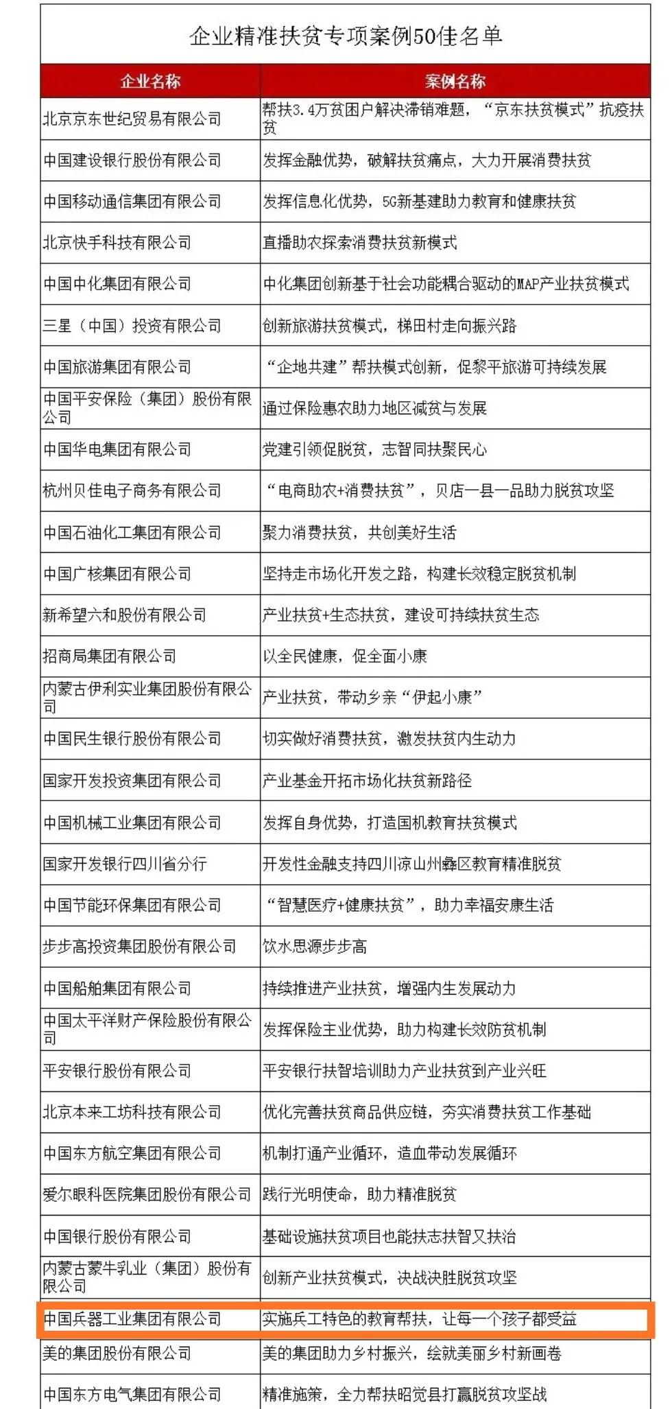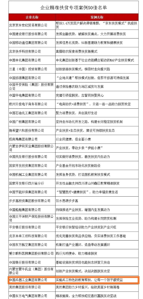 近日,國(guó)務(wù)院扶貧辦發(fā)布2020年企業(yè)精準(zhǔn)扶貧案例獲獎(jiǎng)名單,中國(guó)兵器工業(yè)集團(tuán)有限公司《實(shí)施兵工特色的教育幫扶,讓每一個(gè)孩子都受益》案例入選2020年企業(yè)精準(zhǔn)扶貧專項(xiàng)案例“50佳”。