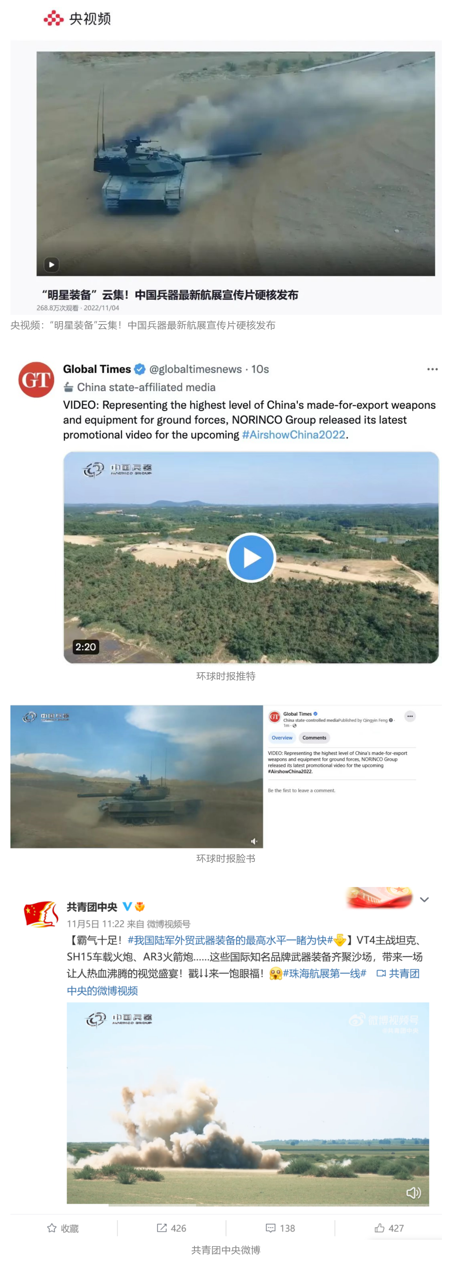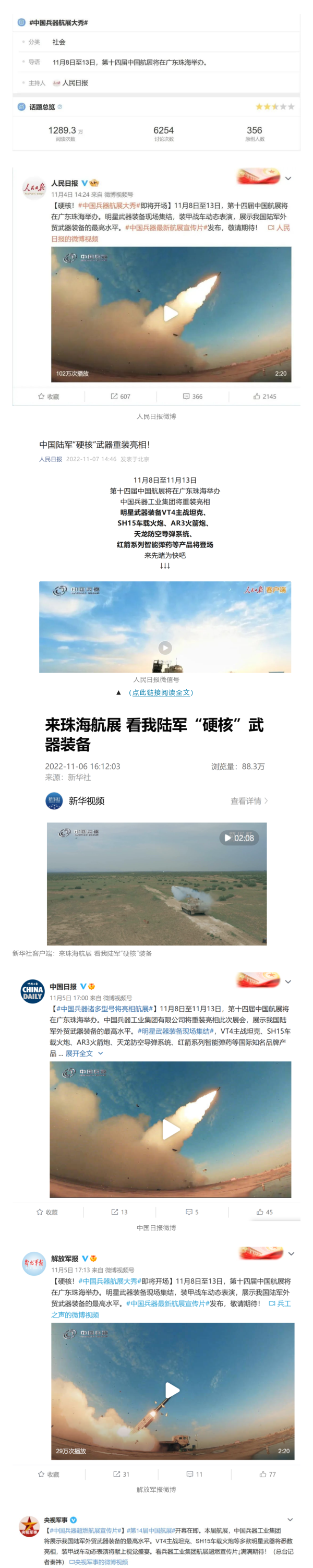 人民日?qǐng)?bào)官方微博、微信公眾號(hào),新華社客戶端、央視新聞客戶端、中國(guó)日?qǐng)?bào)微博、參考消息微信公眾號(hào)、解放軍報(bào)微博、央視軍事微博、CGTN微博、中國(guó)軍號(hào)微博、共青團(tuán)中央微博、環(huán)球時(shí)報(bào)(英文網(wǎng)站、臉書賬號(hào)、推特賬號(hào))、嗶哩嗶哩、學(xué)習(xí)強(qiáng)國(guó)平臺(tái)、國(guó)資小新視頻號(hào)、網(wǎng)易軍事、騰訊軍事、鳳凰軍事、北京日?qǐng)?bào)、東方衛(wèi)視看看新聞全媒體、北京電視臺(tái)等20余家中央主流媒體、國(guó)家部委、省市媒體的新媒體第一時(shí)間播發(fā)集團(tuán)公司航展宣傳片等視頻作品燃爆全網(wǎng),累計(jì)閱讀量突破1700萬人次。集團(tuán)公司微信公眾號(hào)、微博、抖音號(hào)、快手號(hào)、微信視頻號(hào)、知乎號(hào)等新媒體宣傳片播放閱讀量超過800萬人次,點(diǎn)贊超過30萬人次。集團(tuán)公司微信公眾號(hào)推出《硬核!中國(guó)兵器最新航展宣傳片發(fā)布》《中國(guó)兵器航展節(jié)目單,請(qǐng)選出心中明星裝備》《航展首日,中國(guó)兵器閃耀亮相!》等7篇報(bào)道,閱讀量超過25萬人次,集團(tuán)公司微信視頻號(hào)、抖音號(hào)、快手號(hào)等新媒體賬號(hào)發(fā)布“中國(guó)兵器航展大秀”系列視頻,觀看量超過330萬人次。