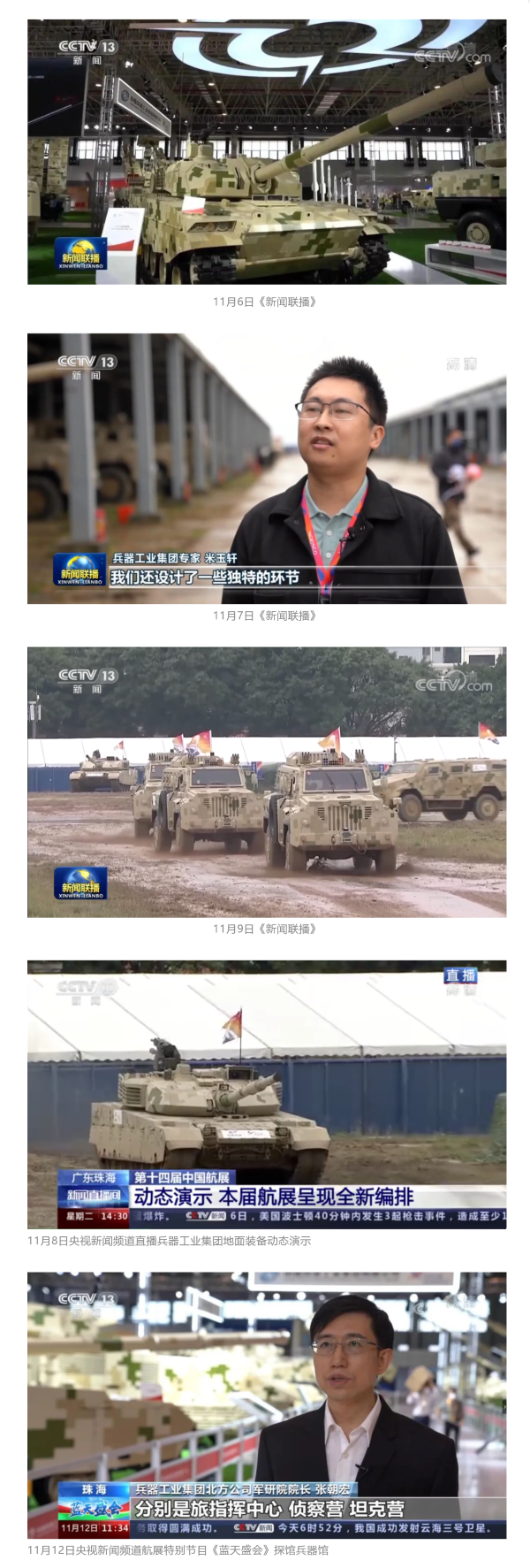 11月6日、7日、9日,央視《新聞聯(lián)播》三次報(bào)道兵器工業(yè)集團(tuán)參展情況,重點(diǎn)介紹了集團(tuán)公司總體參展情況、地面裝備動(dòng)態(tài)演示全新編排、國(guó)產(chǎn)輪式反伏擊車首次采用有人駕駛和無人駕駛混合編隊(duì)等內(nèi)容。11月8日,央視新聞?lì)l道直播地面裝備動(dòng)態(tài)演示;11月12日,央視新聞?lì)l道航展特別報(bào)道《藍(lán)天盛會(huì)》探訪兵器館,采訪兵器工業(yè)集團(tuán)嘉賓對(duì)陸軍合成旅作了報(bào)道。