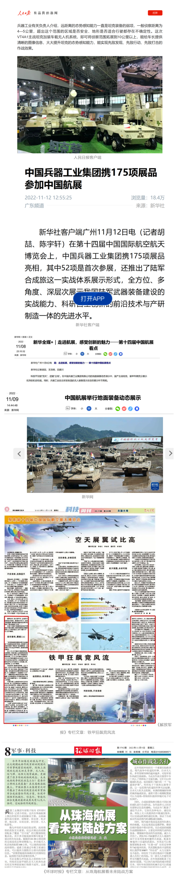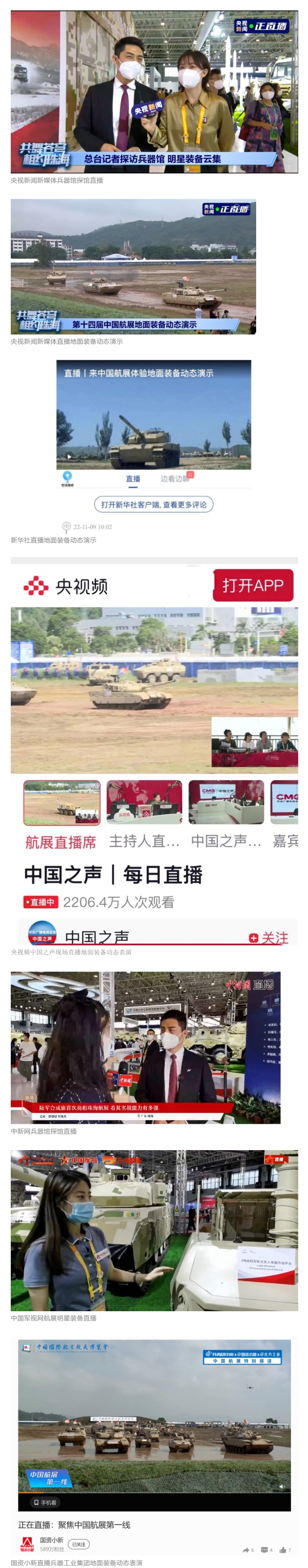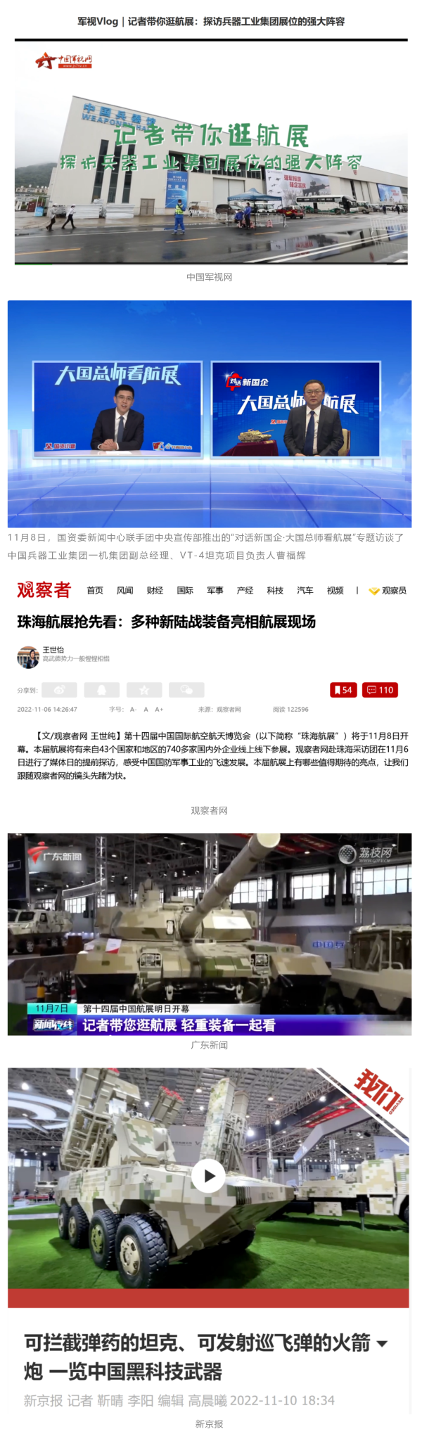 央視國(guó)防軍事頻道航展特別報(bào)道《炫舞天地間》11月12日《賞“鐵甲雄風(fēng)”!看航展地面裝備“鋼鐵洪流”名場(chǎng)面》對(duì)兵器工業(yè)集團(tuán)武器裝備特色亮點(diǎn)進(jìn)行報(bào)道?!秶?guó)防軍事早報(bào)》11月7日推出報(bào)道《第十四屆中國(guó)國(guó)際航空航天博覽會(huì)明天開幕 中國(guó)兵器館首次以陸軍合成旅實(shí)戰(zhàn)體系形式展出》,對(duì)兵器館陸軍合成旅實(shí)戰(zhàn)體系進(jìn)行報(bào)道。《軍事報(bào)道》11月9日推出《第十四屆中國(guó)國(guó)際航空航天博覽會(huì) 地面兵器裝備首次聯(lián)合陸航直升機(jī)進(jìn)行動(dòng)態(tài)展示》報(bào)道?!盾娒孕刑煜隆?1月9日推出報(bào)道《軍迷打卡航展2022》以專業(yè)軍迷視角探館兵器館,全面展示兵器工業(yè)集團(tuán)參展裝備特色亮點(diǎn)。