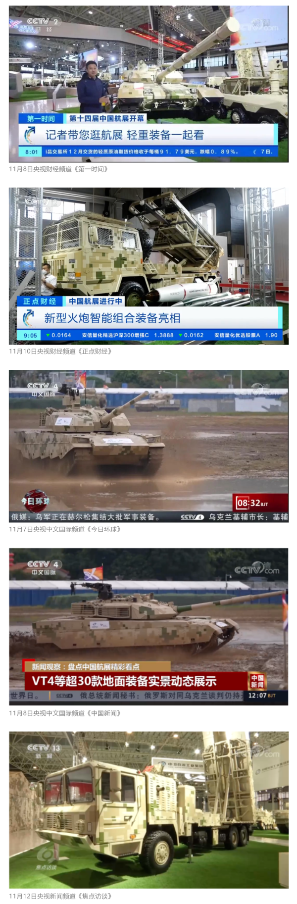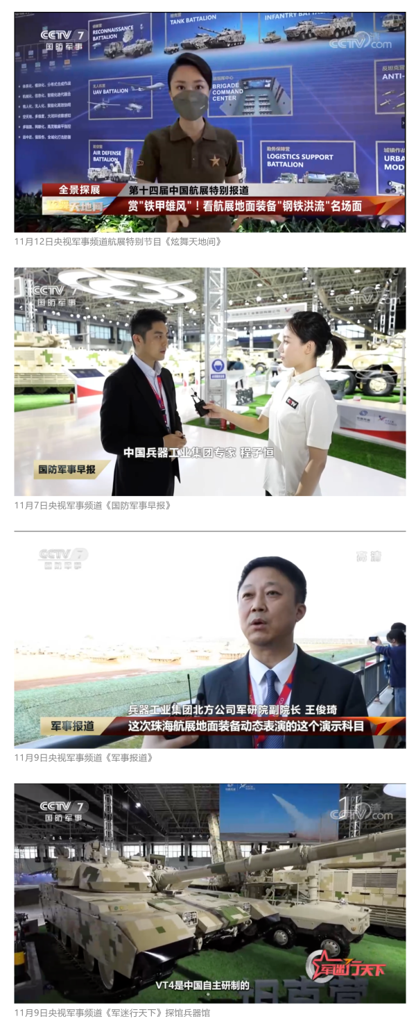 此次航展,央視新聞?lì)l道《朝聞天下》《新聞直播間》《東方時(shí)空》《共同關(guān)注》《新聞30分》《24小時(shí)》、央視國(guó)防軍事頻道《國(guó)防軍事早報(bào)》《軍事報(bào)道》《軍迷行天下》、央視國(guó)際頻道《中國(guó)新聞》《今日環(huán)球》等欄目共播出兵器工業(yè)集團(tuán)參展相關(guān)新聞報(bào)道30余條。