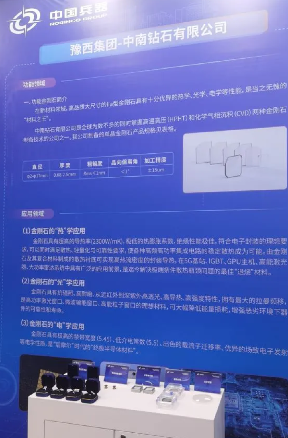 豫西集團中南鉆石展出的高品質(zhì)、大尺寸lla型金剛鉆石具有十分優(yōu)異的熱學、光學、電學性能,是新材料領域當之無愧的“鉆石之王”。