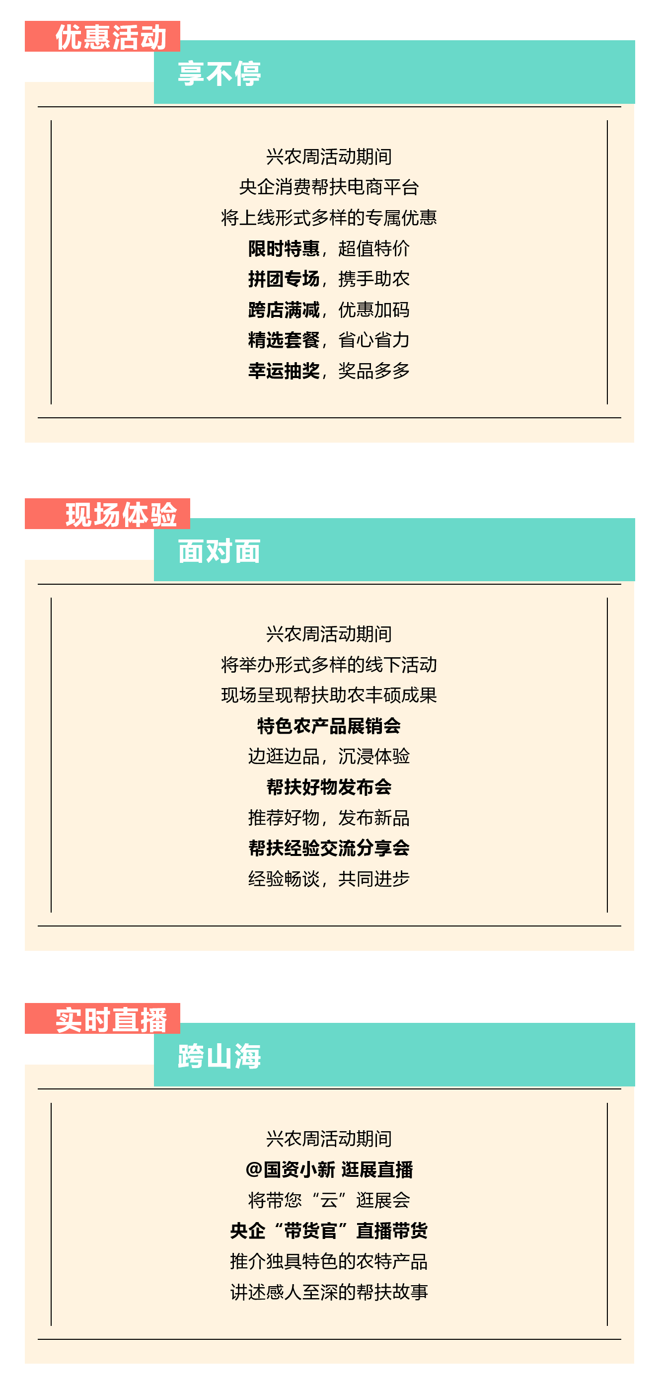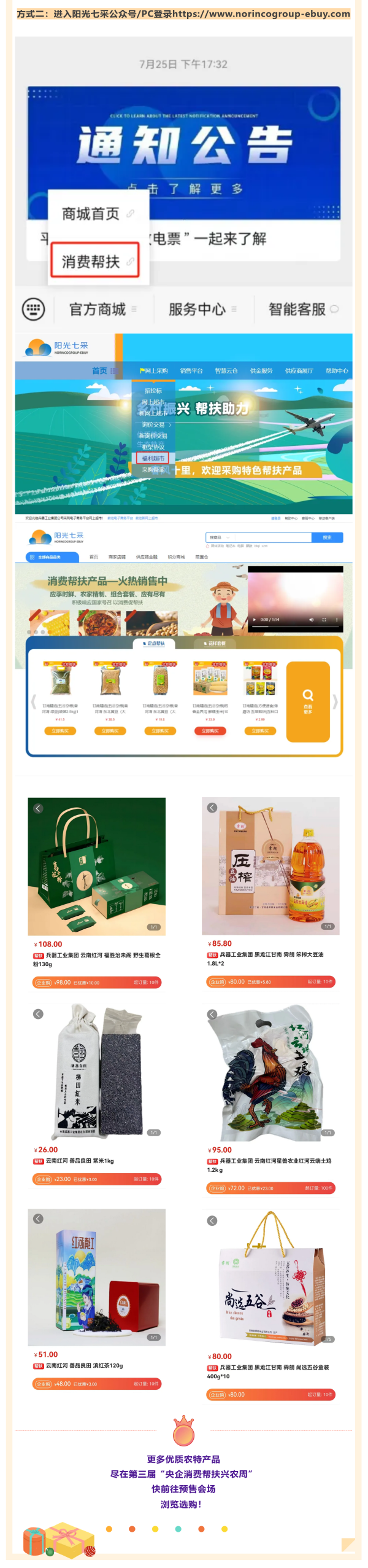 百家央企聚合力 消費幫扶促振興 第三屆“央企消費幫扶興農周” 預售已啟動 8月30日 興農周活動將正式開啟 “央企消費幫扶興農周”由國務院國資委社會責任局指導,央企消費幫扶電商平臺(國網數字科技控股有限公司)主辦,國務院國資委機關服務管理局、國務院國資委新聞中心、國網北京市電力公司、各中央企業(yè)電商平臺聯合協辦。 活動以“央企攜手,興農惠民”為主題,組織動員中央企業(yè)所屬各單位各部門(特別是工會、食堂)、廣大干部職工、上下游供應商和業(yè)務合作伙伴采購幫扶縣的優(yōu)質農產品,促進脫貧地區(qū)產業(yè)發(fā)展和脫貧群眾穩(wěn)定增收,鞏固拓展脫貧攻堅成果。 預售活動火熱開啟 為方便大家提前選購 此次預售期升級為10天 (8月20日-8月29日) 誠邀下單 兵器工業(yè)集團定點幫扶 黑龍江甘南縣、云南紅河縣 農特產品! 8月30日-9月5日 請鎖定“央企館-兵器工業(yè)集團” 我們一起共譜鄉(xiāng)村振興新篇章! |