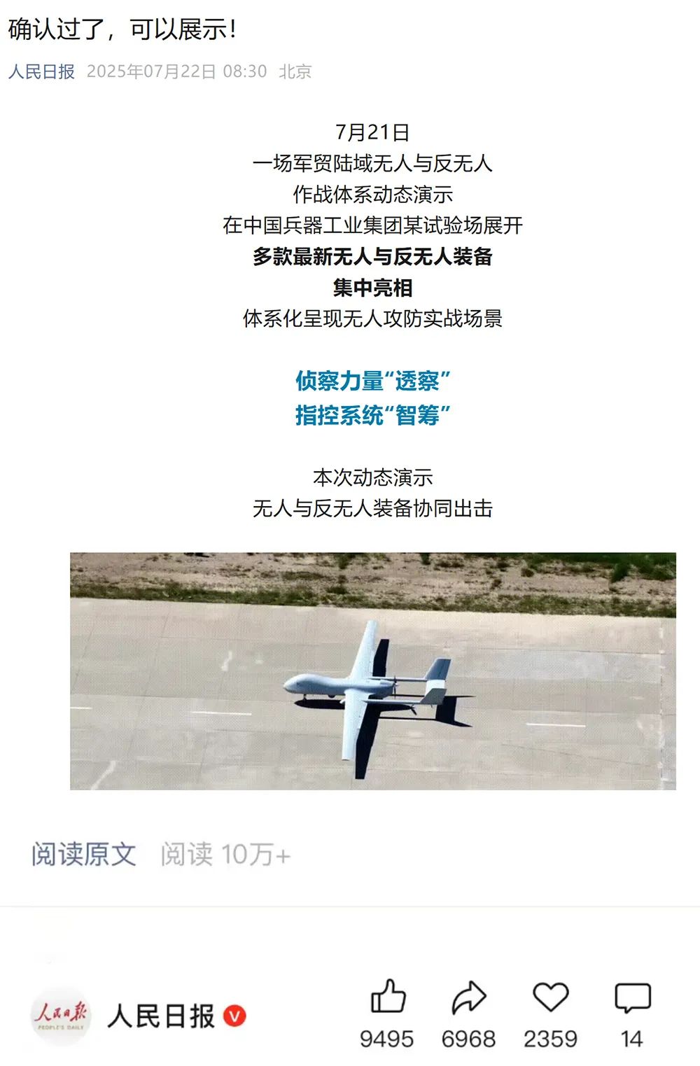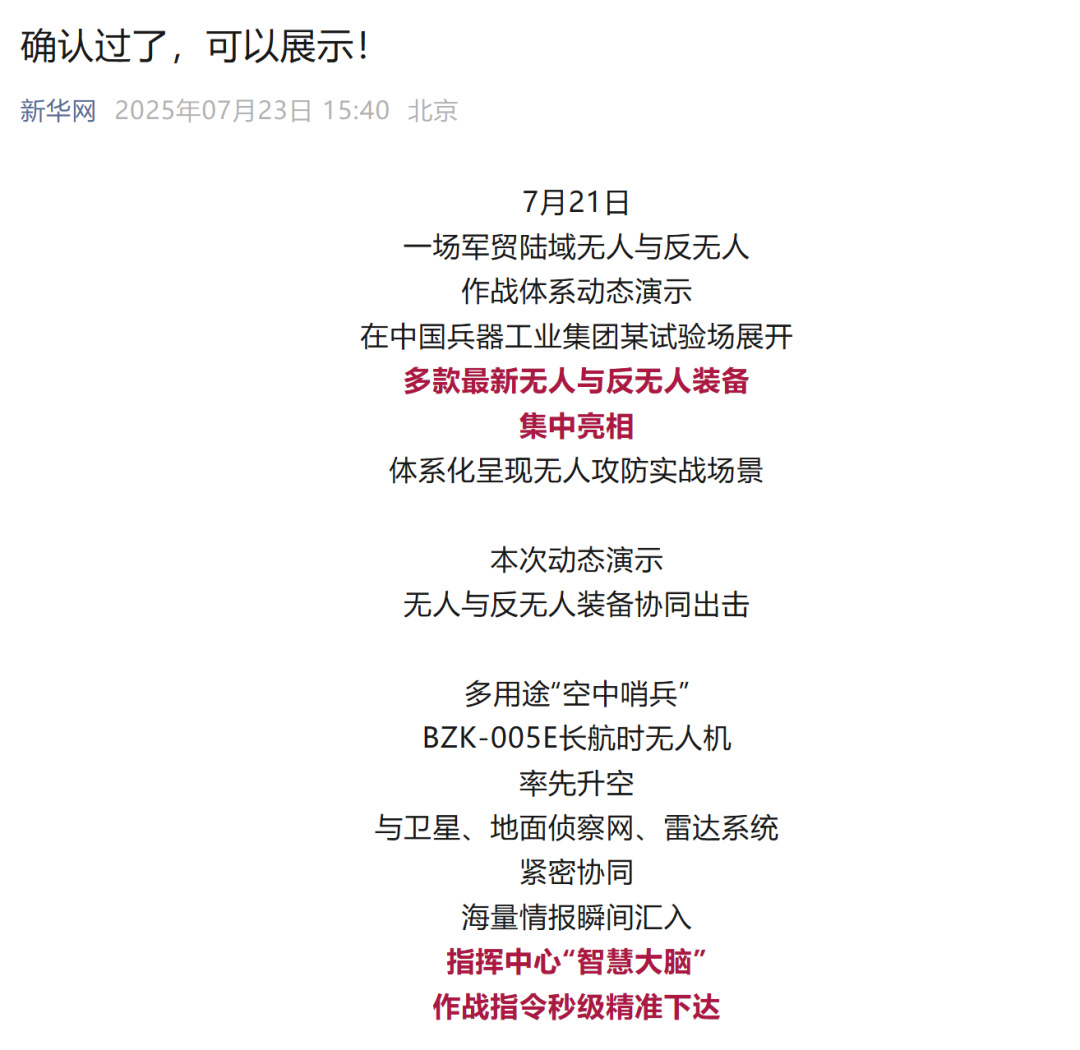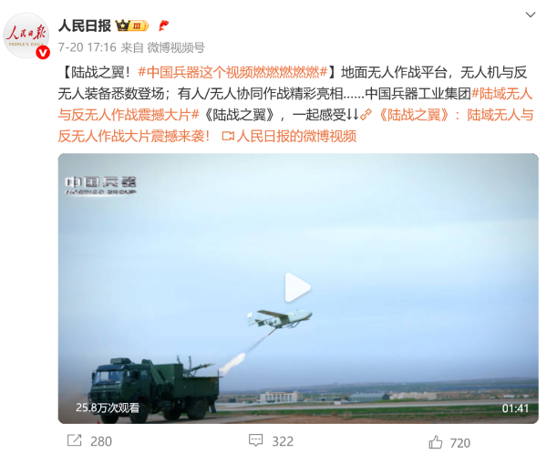 7月21日,中國(guó)兵器工業(yè)集團(tuán)有限公司在位于內(nèi)蒙古的某試驗(yàn)場(chǎng)舉辦軍貿(mào)陸域無(wú)人與反無(wú)人作戰(zhàn)體系主題日活動(dòng),攜無(wú)人機(jī)、巡飛彈、反無(wú)人機(jī)等最新武器裝備登場(chǎng)亮相,展現(xiàn)了一場(chǎng)無(wú)人與反無(wú)人領(lǐng)域激烈對(duì)抗的實(shí)戰(zhàn)場(chǎng)景。中央主流媒體、地方媒體、知名網(wǎng)絡(luò)媒體,以及集團(tuán)公司各宣傳平臺(tái)紛紛進(jìn)行報(bào)道,多次登上熱搜,引發(fā)廣泛關(guān)注。 央視新聞?lì)l道《新聞直播間》《東方時(shí)空》《24小時(shí)》、國(guó)防軍事頻道《正午國(guó)防軍事》《軍事報(bào)道》《國(guó)防軍事早報(bào)》、中文國(guó)際頻道《今日環(huán)球》、央視軍事新媒體等報(bào)道了集團(tuán)公司軍貿(mào)陸域無(wú)人與反無(wú)人作戰(zhàn)體系首次公開(kāi)實(shí)裝動(dòng)態(tài)演示有關(guān)情況,重點(diǎn)介紹了無(wú)人與反無(wú)人作戰(zhàn)最新裝備。 央視新聞?lì)l道《新聞直播間》:內(nèi)蒙古 軍貿(mào)陸域無(wú)人與反無(wú)人作戰(zhàn)最新裝備亮相 央視新聞?lì)l道《新聞直播間》:內(nèi)蒙古 軍貿(mào)陸域無(wú)人與反無(wú)人作戰(zhàn)最新裝備亮相 記者探訪無(wú)人裝備展區(qū) 央視新聞?lì)l道《新聞直播間》:軍貿(mào)陸域無(wú)人與反無(wú)人作戰(zhàn)最新裝備亮相·記者探訪 最強(qiáng)“盾牌” 反無(wú)人機(jī)系統(tǒng)新升級(jí) 人民日?qǐng)?bào)微博、央視軍事微博、央視新聞客戶端、中國(guó)新聞網(wǎng)、中新社國(guó)是直通車(chē)抖音、環(huán)球網(wǎng)微博、環(huán)球時(shí)報(bào)(X平臺(tái)、英文版客戶端)、中國(guó)日?qǐng)?bào)網(wǎng)、央視軍事報(bào)道微博、中國(guó)軍號(hào)微博、中央廣播電視總臺(tái)“空天逐夢(mèng)”微信視頻號(hào)、共青團(tuán)中央B站、國(guó)資小新微博等中央主流媒體、國(guó)家部委的新媒體播發(fā)集團(tuán)公司陸域無(wú)人與反無(wú)人作戰(zhàn)大片等視頻作品。 人民日?qǐng)?bào)微博 央視軍事微博 人民日?qǐng)?bào)、新華網(wǎng)、央視軍事、央視新聞、中央廣播電視總臺(tái)中國(guó)之聲、中國(guó)新聞網(wǎng)、中國(guó)日?qǐng)?bào)網(wǎng)、中國(guó)日?qǐng)?bào)英文報(bào)刊《CHINA DAILY》、《科技日?qǐng)?bào)》、光明日?qǐng)?bào)客戶端、環(huán)球網(wǎng)、環(huán)球時(shí)報(bào)、人民日?qǐng)?bào)海外版-海外網(wǎng)、央視網(wǎng)、小央視頻、參考消息、瞭望東方周刊、共青團(tuán)中央、國(guó)資小新新媒體、新浪網(wǎng)、騰訊網(wǎng)、搜狐網(wǎng)、鳳凰網(wǎng)、網(wǎng)易網(wǎng)等中央主流媒體、國(guó)家部委的新媒體及知名網(wǎng)絡(luò)媒體對(duì)集團(tuán)公司軍貿(mào)陸域無(wú)人與反無(wú)人作戰(zhàn)體系主題日活動(dòng)進(jìn)行了圖文、音頻、視頻報(bào)道。 央視軍事微信 人民日?qǐng)?bào)微信 新華網(wǎng)微信 來(lái)源/各主流媒體 |