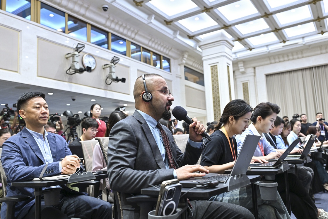 8月20日,國(guó)務(wù)院新聞辦公室在北京舉行新聞發(fā)布會(huì),閱兵領(lǐng)導(dǎo)小組辦公室副主任、中央軍委聯(lián)合參謀部作戰(zhàn)局少將副局長(zhǎng)吳澤棵,中國(guó)人民解放軍中部戰(zhàn)區(qū)閱兵指揮機(jī)構(gòu)辦公室常務(wù)副主任、政治工作部少將副主任徐貴忠介紹閱兵準(zhǔn)備工作有關(guān)情況,并答記者問(wèn)。這是記者在現(xiàn)場(chǎng)提問(wèn)。